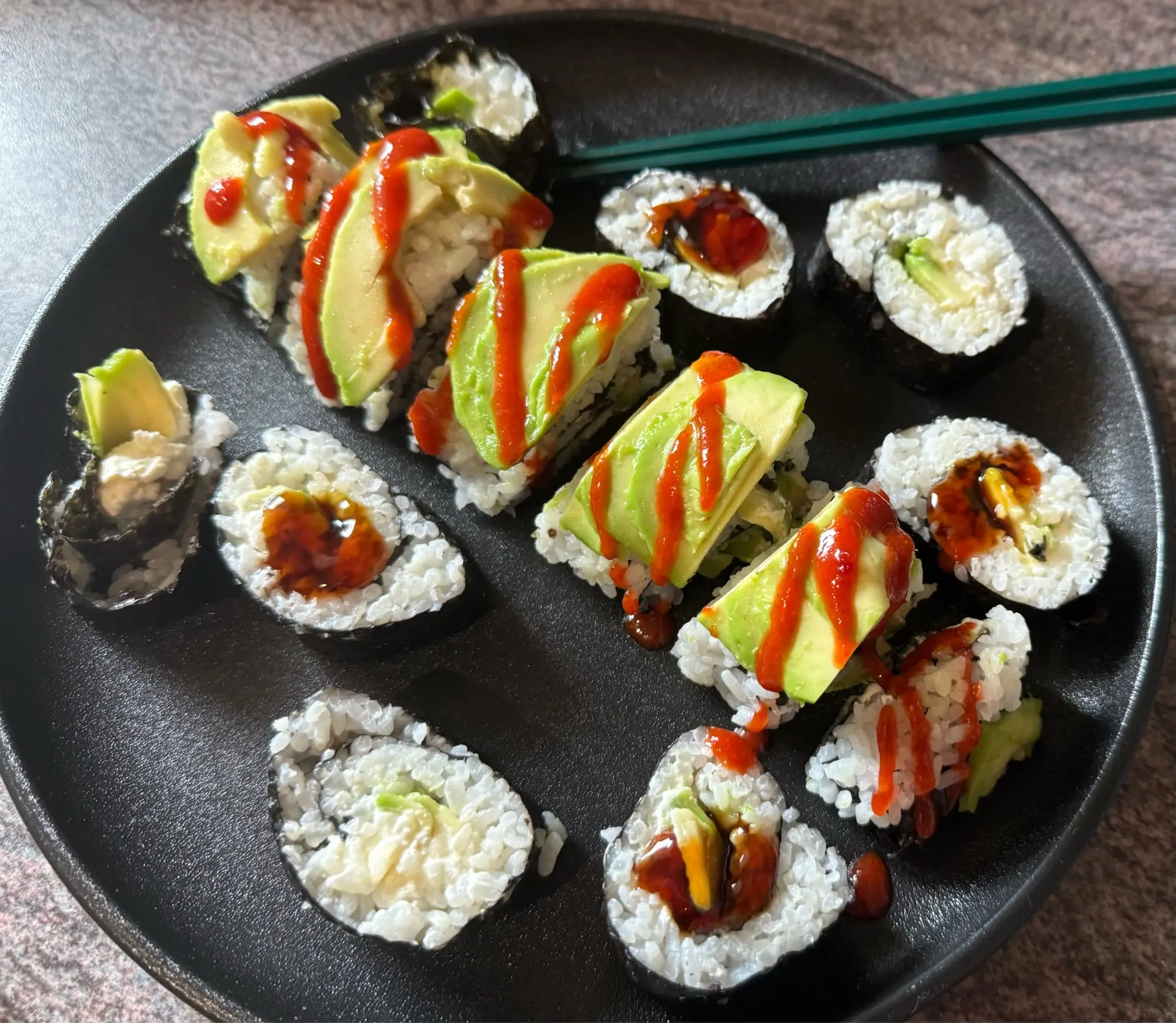 A: The plates are a solid black, minimalist design that suits modern dining.